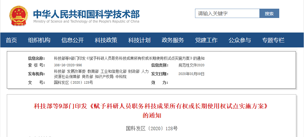 科技部等9部門印發《賦予科研人員職務科技成果所有權或長期使用權試點實施方案》的通知