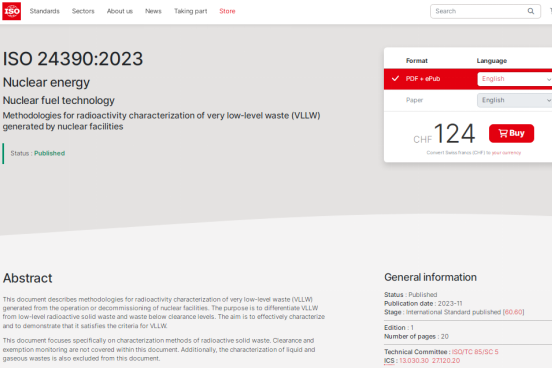 11月30日,由中輻院主導(dǎo)編制的國(guó)際標(biāo)準(zhǔn)ISO 24390:2023《核設(shè)施產(chǎn)生極低水平放射性廢物放射性表征方法學(xué)》正式發(fā)布,該標(biāo)準(zhǔn)是由我國(guó)在放射性廢物管理領(lǐng)域編制發(fā)布的首個(gè)ISO國(guó)際標(biāo)準(zhǔn),是中輻院高質(zhì)量發(fā)展和創(chuàng)建”國(guó)際一流”院所的又一重要成果,標(biāo)志著我國(guó)在放射性廢物治理領(lǐng)域的國(guó)際標(biāo)準(zhǔn)化工作取得重要突破